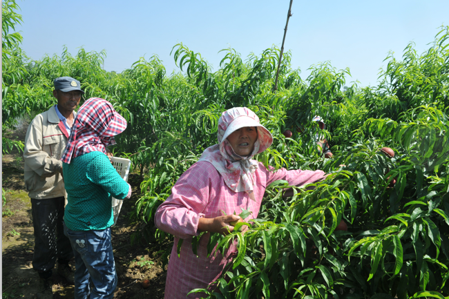 “到農(nóng)場來干活,距家又不遠(yuǎn),而且常年都有事做,家務(wù)事又不耽擱,每年很輕松收入就近兩萬元。”李老漢一邊拎著塑料筐跟在婦女后邊放著桃,一邊跟筆者說著。三四年前,李老漢就開始到果園里來務(wù)工,主要從事果樹的修剪、施肥、疏花、采摘、鋤草、澆水等管理工作。與李老漢那樣,僅新東村在果園常年打工的還有其他10多名村民。