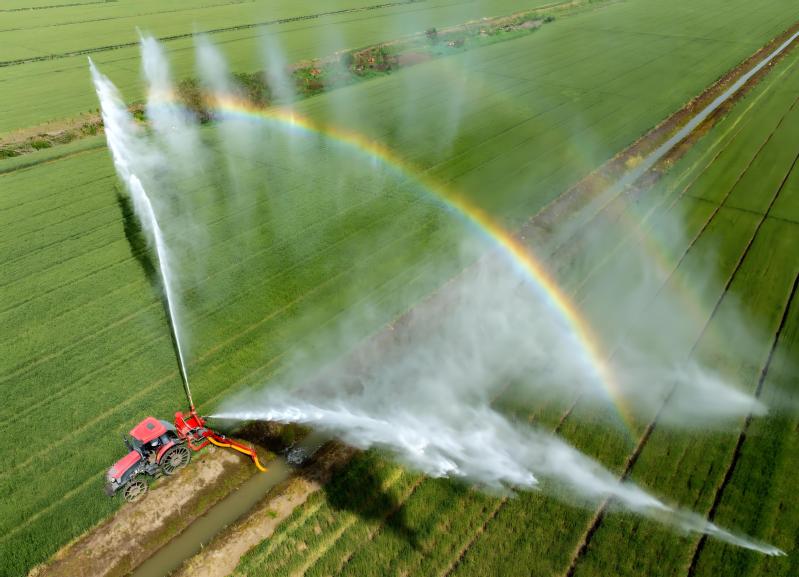 5月2日,正值冬小麥進入開花灌漿關(guān)鍵期,江蘇省農(nóng)墾白馬湖農(nóng)場調(diào)集10多臺噴水機進行分區(qū)抗旱作業(yè),確保近5萬畝冬小麥增產(chǎn)增收。圖為工作人員駕駛噴水機對麥田進行噴灌作業(yè)。賀敬華 攝 (視覺江蘇網(wǎng)供圖)