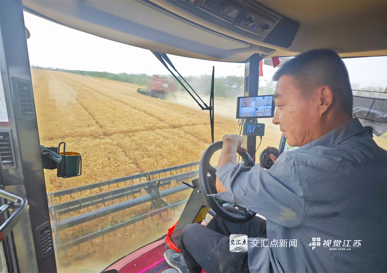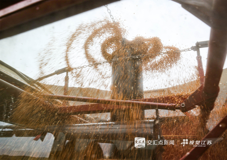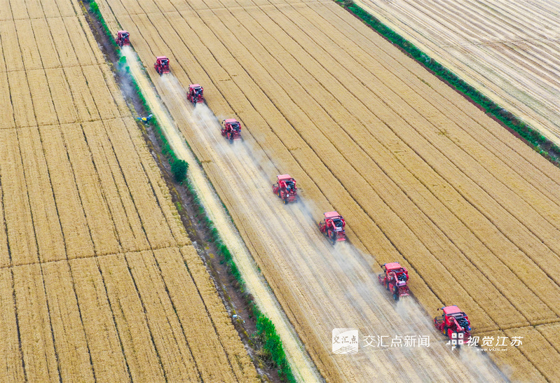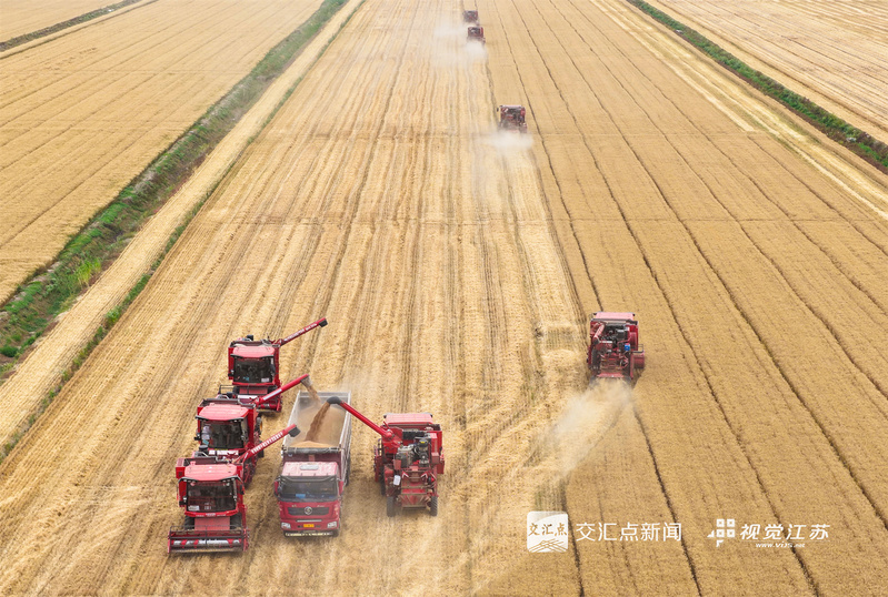 (特約攝影 許昌銀 錢厚紅 15:24攝 20:39上線)五月的麥田,金穗飄香。5月26日,淮安盱眙洪澤湖畔的江蘇農(nóng)墾三河農(nóng)場的3.82萬畝小麥開鐮收割。當(dāng)?shù)乩们绾锰鞖饧泳o收割,確保顆粒歸倉。