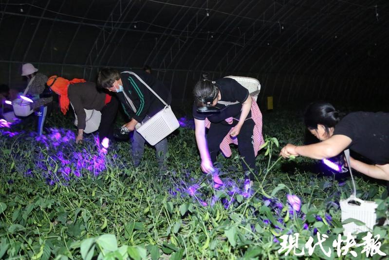 “搜尋時一定要仔細,左右兩邊都得留意,才能把豆丹抓全?!眴误w2號大棚的豆丹養(yǎng)殖負責人李加祥一邊熟練地捕捉豆丹,一邊向工作人員傳授經驗,“豆丹和豆葉顏色相近,白天捕捉極易遺漏。但到了夜間,紫光燈一照,豆丹就像會發(fā)光的螢火蟲,清晰可見,不僅抓捕效率高,還能做到顆粒歸倉?!睘榇_保此次捕捉行動順利開展,園區(qū)提前規(guī)劃,從人員調配到工具準備,每一個環(huán)節(jié)都精心部署,為高效捕捉打下堅實基礎。