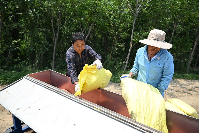 5月28日、「9機能一體型」稲?麥用耕運播種機にもみを補充する三河農場の職員。(盱眙=新華社記者/季春鵬)
