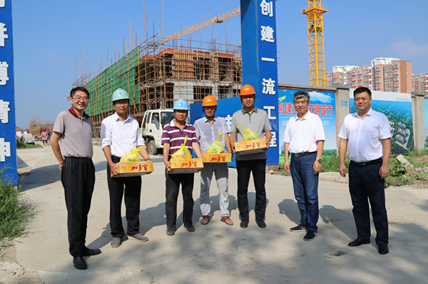 8月8日上午,烈日當頭,酷暑難耐,在東辛農場有限公司銀羽住宅新區供電線路鋪設現場,集團公司工會主席佟曉廷一行在東辛黨委書記韓中書、紀委書記王緒國、