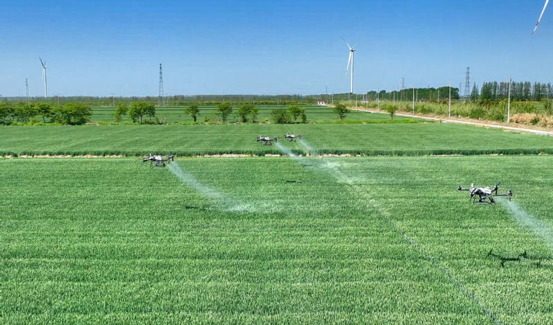 在蘇墾農(nóng)發(fā)新洋分公司新北生產(chǎn)區(qū)高標(biāo)準(zhǔn)農(nóng)田,五臺(tái)滿(mǎn)載生物藥劑的北斗導(dǎo)航植保無(wú)人機(jī)正沿著預(yù)設(shè)航線(xiàn)精準(zhǔn)噴灑葉面肥,多光譜測(cè)繪無(wú)人機(jī)同步監(jiān)測(cè)苗情長(zhǎng)勢(shì),全力守護(hù)麥田健康。新洋分公司將綠色防控與統(tǒng)防統(tǒng)治有機(jī)結(jié)合,所有基層一線(xiàn)青年員工全部掌握無(wú)人機(jī)操作技術(shù),實(shí)現(xiàn)了近6萬(wàn)畝農(nóng)田的飛防作業(yè)全覆蓋。目前,共引入更新大疆T70、T100等新型無(wú)人機(jī)23臺(tái)。