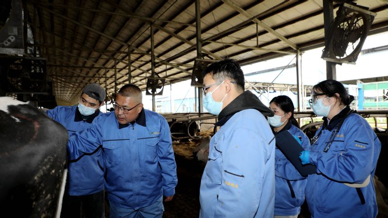 “從外部叩診聲音判斷,這頭牛的肺部已由清音轉(zhuǎn)為濁音,聽診器中也有明顯的氣泡炸裂聲,要馬上進(jìn)行治療。”11月19日下午,在東辛東旺奶牛公司生態(tài)養(yǎng)殖示范場,一場現(xiàn)場教學(xué)正在進(jìn)行,獸醫(yī)主管周文波正帶領(lǐng)獸醫(yī)組人員對病癥牛只開展日常巡診。通過觸診、視診、嗅診、聽診、叩診等診斷方法,認(rèn)真細(xì)致檢查牛只體況,周文波“手把手”傳授獸醫(yī)組人員如何快速準(zhǔn)確診斷病因,做到對癥下藥。“223180號奶牛奶液出現(xiàn)明顯絮狀物,使用頭孢噻呋乳注搭配美洛昔康皮下注射進(jìn)行治療。213722號奶牛體溫升高,要做好提前干預(yù)。在日常巡舍中一定要多觀察多診斷,才能及時發(fā)現(xiàn)奶牛體征異樣。”周文波邊查看牛只狀況邊叮囑獸醫(yī)組人員。東旺奶牛公司生態(tài)養(yǎng)殖示范場存欄奶牛4800余頭,日常的奶牛管護(hù)、產(chǎn)后護(hù)理、轉(zhuǎn)群分群及病牛治療等工作任務(wù)十分繁重,獸醫(yī)組嚴(yán)格遵循“日巡查+周例會+月巡診”的工作機制,通過巡棚查看、巡診交流,全面了解掌握牛只的健康與成長狀況,做到有檢查、有治療、有回診,保障疫病防控和奶產(chǎn)品安全供給。“每個月,周主管都會定期帶我們進(jìn)行巡診,現(xiàn)場診斷指導(dǎo),我們的業(yè)務(wù)水平有了明顯提升,工作起來也更得心應(yīng)手了。”獸醫(yī)組工作人員楊華說。東
