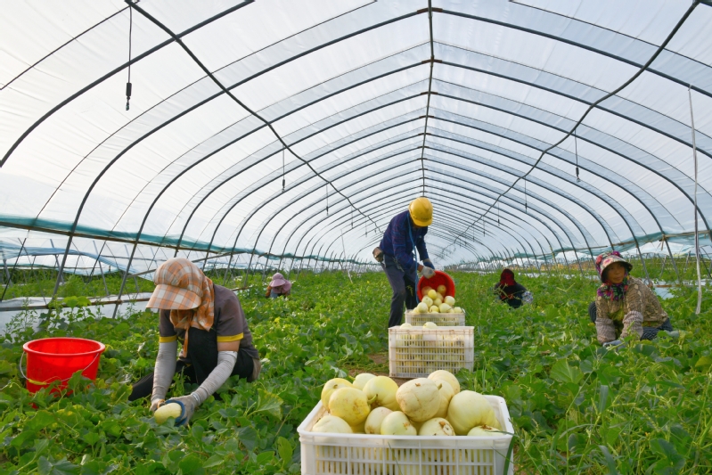 走進淮海農場高效種植園區,一排排農業大棚整齊排列,翠綠的藤蔓間綴滿圓潤飽滿的甜瓜,散發著誘人的香氣。工人們穿梭其間,熟練地采摘、分揀、沖洗、裝箱,一車車新鮮甜瓜被迅速運往市場。圖為工作人員正在采摘香瓜。