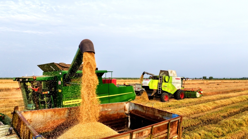 風吹麥浪,滿地金黃。蘇墾農發東壩頭分公司搶抓晴好天氣加緊搶收,數臺收割機馬力全開在田間來回穿梭,金黃的麥浪在轟鳴聲中起伏。