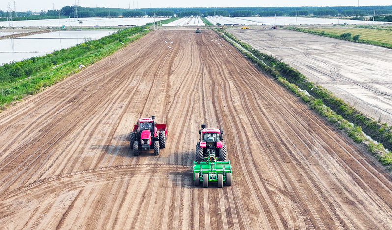 5月25日,蘇墾農(nóng)發(fā)弶港分公司第二生產(chǎn)區(qū)8連田間,北斗衛(wèi)星導(dǎo)航鏟運(yùn)機(jī)、激光平整機(jī)等25臺(tái)套大型機(jī)械來(lái)回穿梭,全力推進(jìn)土地平整進(jìn)度。
