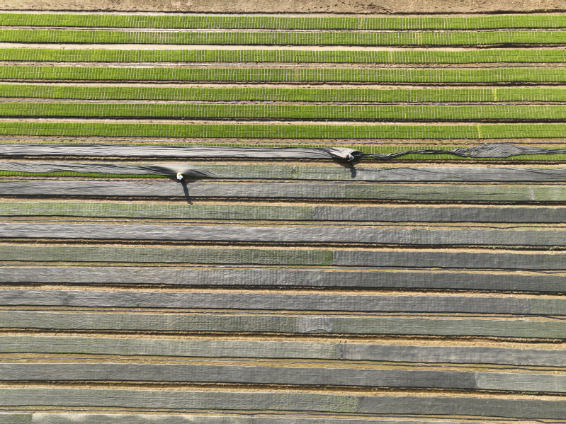 在蘇墾農(nóng)發(fā)崗埠分公司田頭,職工們正在把經(jīng)“暗化”后的秧盤移到大田里,采用微噴灌技術(shù)進(jìn)行集中育秧,加強(qiáng)精準(zhǔn)水肥調(diào)控、集中標(biāo)準(zhǔn)化育秧管理,為即將開展的機(jī)插秧作業(yè)夯實(shí)基礎(chǔ)。
