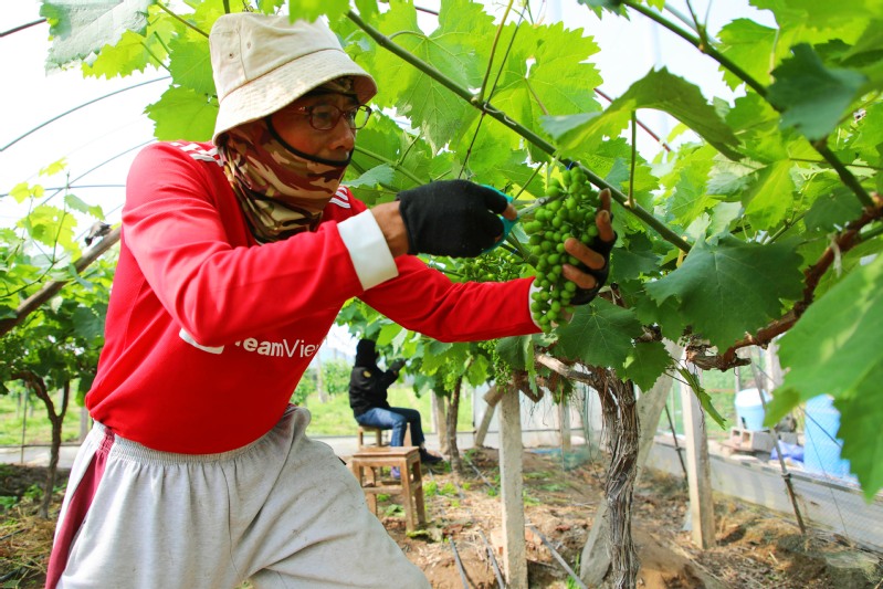 連日來(lái),江心沙農(nóng)場(chǎng)果農(nóng)在葡萄園忙著疏果作業(yè),根據(jù)坐果率高低剪掉病蟲果、裂果、日灼果、畸形果等,選留大小一致、向外排列整齊的果子,做到密度適中、串型合理,確保采摘時(shí)高產(chǎn)與優(yōu)質(zhì)并舉。